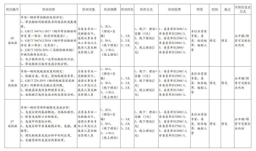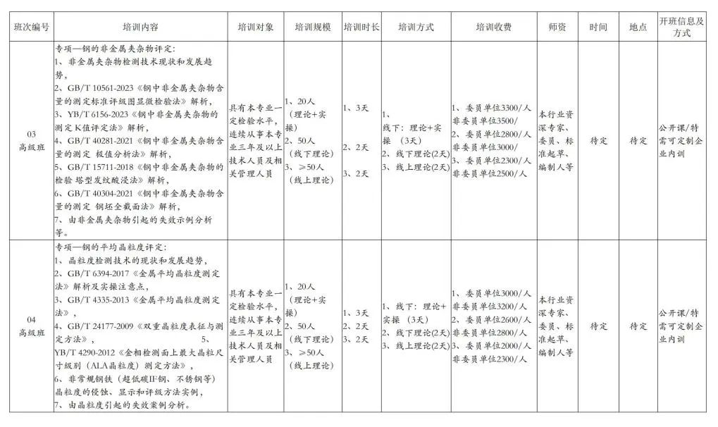 本年度培訓在充分征求各企事業單位需求的基礎上形成,根據不同層次的檢測技術人員需求,課程主要分為初級班、中級班和高級班。培訓形式包含線下理論課+實操、線下理論課和線上理論課等多種方式,師資主要邀請本行業資深專家、委員、標準起草或編制人等國內的專家進行授課。同時為了大家有好的培訓效果,線下課程采取規模定額制,保證學習人員對培訓內容的充分理解和運用。培訓內容安排見附件1《2025年度鋼鐵行業金相檢驗培訓計劃表》。