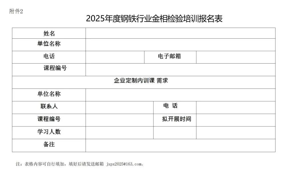 請填寫2025年度鋼鐵行業金相檢驗培訓報名表(附件2)通過電子郵件發送至郵箱(jxpx2025@163.com)。