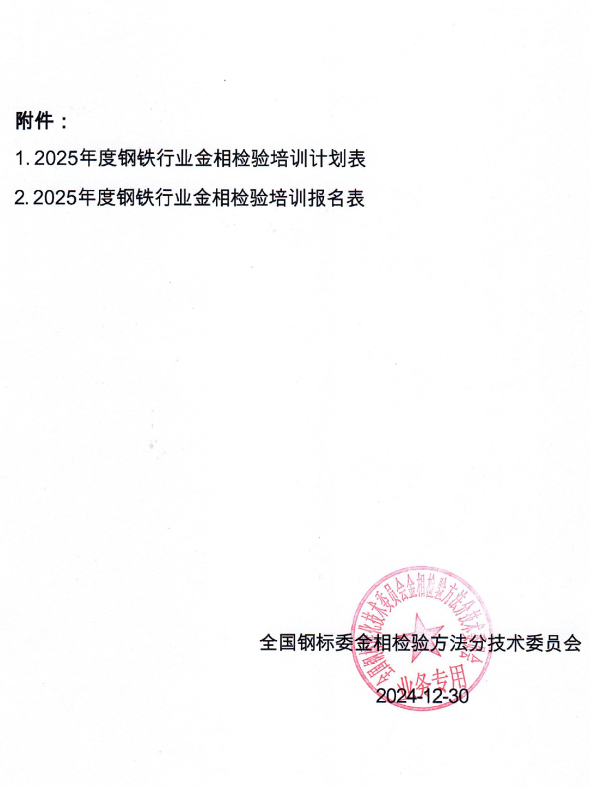 隨著鋼鐵行業的發展以及鋼鐵產品的多元化,鋼鐵產品檢驗行業人才的培養工作也將進入一個全新階段。為了進一步提升我國金相檢驗分析技術領域從業人員的專業技能與理論水平,促進金相分析技術的創新與應用,由全國鋼標委金相檢驗方法分技術委員會組織鋼鐵行業金相檢驗方法技術方面的培訓。通過開展鋼鐵行業金相檢驗方法領域多層次、多項目、多形式的內容培訓,全面提升本行業檢驗技術水平和創新能力,為我國鋼鐵行業高質量發展提供強有力的檢測分析人才保障。結合當前金相檢測技術水平和各企事業發展的需求,充分發揮平臺作用,2025年度培訓計劃及有關事項通知如下: