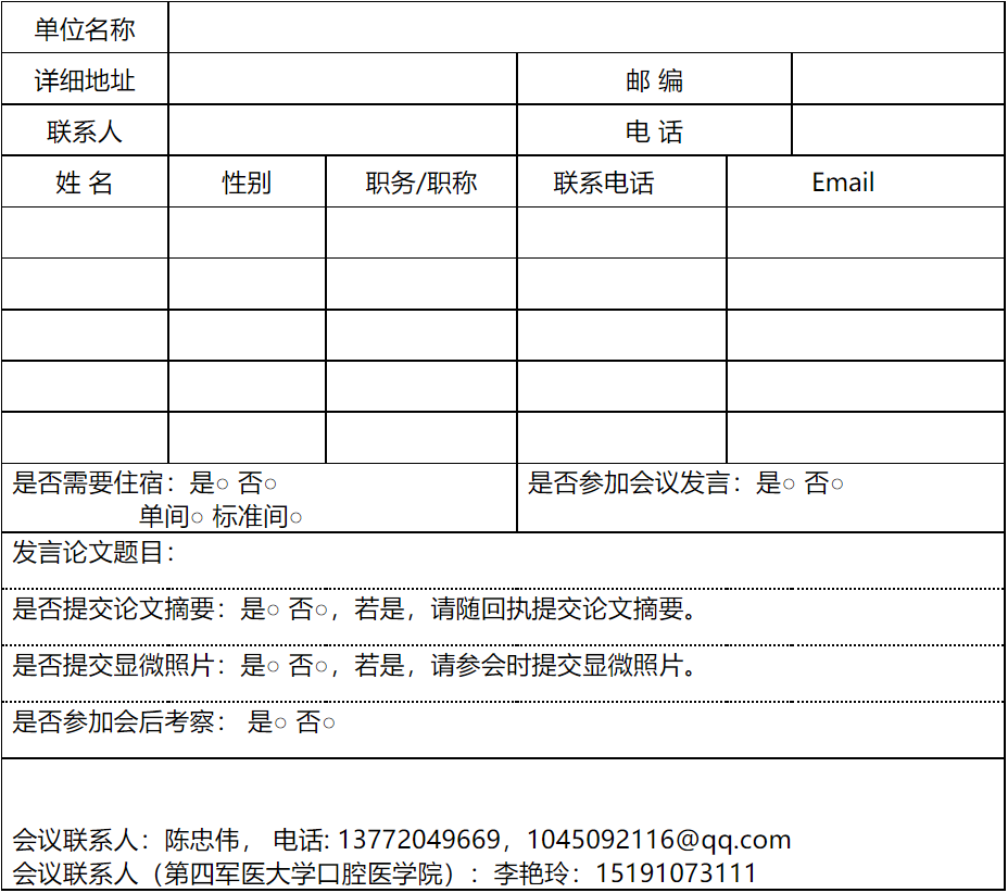 陜西省電子顯微鏡學會 各有關單位: 根據陜西、甘肅、青海等省電鏡學會于2012年的協商結果,擬恢復西北五省電鏡學術與技術交流的傳統,以便促進西北地區電鏡事業的發展。茲定于2013年 5月15日至19日在陜西省西安市第四軍醫大學口腔醫學院舉辦“西北五省第六屆電鏡學術交流及技術研討會”,并由陜西省電子顯微鏡學會承辦。歡迎電鏡工作者及相關的科研人員、教師和學生參加。現將具體事項通知如下: 一、會議研討內容: 1、國內著名的電子顯微學者特邀報告; 2、西北地區電鏡工作者的學術與技術交流; 3、透射電鏡、掃描電鏡、微束分析儀器、掃描探針顯微鏡、激光共聚焦顯微鏡等在材料科學、納米科技、物理學、生命科學、化學化工、環境科學、地質學等領域的基礎和應用研究成果; 4、電子顯微學相關儀器的理論、技術和實驗方法的發展與改進; 5、電鏡的使用、改進及維修等經驗交流; 6、國內外電鏡及相關儀器的新技術、新產品交流; 7、電子顯微照片展覽與評獎。 二、會議日期: 會議日期:2013年5月15日-5月19日 報到時間:5月15日14時至5月17日9時前 報到聯系人:段小紅029-84776169 李艷玲 15191073111 報到地點:陜西省西安市長樂西路145號 第四軍醫大學口腔醫學院教學中心一樓顯微CT室 會議地點: 第四軍醫大學口腔醫學院多媒體階梯教室 三、收費標準 會務費:800元 注:會議食宿費自理。 四、聯系方式: 請準備參加會議的代表提前安排好工作,填寫報名回執,發送至會務組,以便安排會務后續工作。 聯系人:陳明霞,陳忠偉 電 話:029-82655158,13088990058 (陳明霞) 029-88493450-8001,13772049669 (陳忠偉) 郵 箱:cmxem@mail.xjtu.edu.cn (陳明霞) 1045092116@qq.com (陳忠偉) 陜西省電子顯微鏡學會 甘青寧三省聯合電子顯微鏡學會 二0一三年四月十五日 “西北五省第六屆電鏡學術交流及技術研討會”回執表 地址:西京醫院對面約200米 第四軍醫大學向東50米 聯系方式:029-89100006(海景) 電話:029-82545113 88105558陜電會培字2013(02)號
