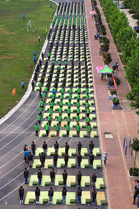 8月26日下午,在學院西操場舉行15級新生疊被子比賽。一天的軍訓結束后,同學們帶著自己的涼席和被子來到操場,比賽開始,上千人同時疊被子的場面著實令人震撼。