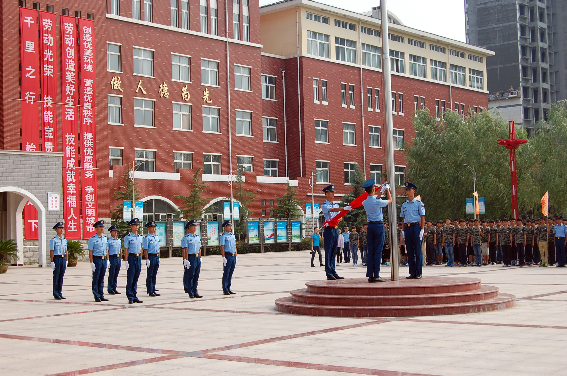 升旗儀式在主持人的宣布下正式開始。駐汴95936部隊為我校新生做國旗護衛隊,高昂的胸膛,嘹亮的口號,豪邁的步伐,彰顯著教官們獨有的風采。