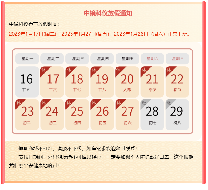 玉免迎春至,黃鶯報喜來。值此新春佳節來臨之際,中鏡科儀攜全體員工謹向長期以來關心、支持、信賴我們的各級領導、老師、社會各界朋友、廣大客戶以及合作伙伴,致以衷心的感謝和美好的祝愿! 逐漸遠去的2022年,我們歷經困難與挑戰,我們收獲成長與喜悅。加速奔來的2023年,中鏡科儀全體同仁將繼續振作精神、踔厲奮發、勇毅前行,全方位推動公司高質量發展行穩致遠,再創中鏡科儀新輝煌! 最后,祝大家在新的一年里闔家幸福、身體健康、萬事如意、新年快樂!