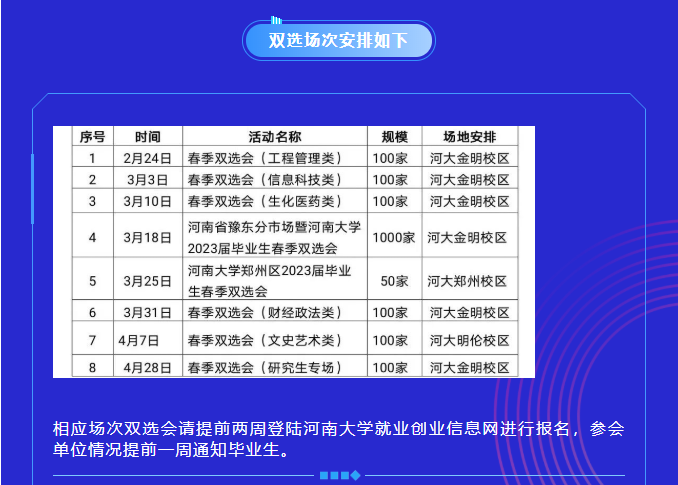 學校倡導采取精準化、小型化模式開展招聘活動,具體參會報名通知請及時關注我?!熬蜆I創業信息網”或“河大就業創業”微信公眾號發布的活動信息。