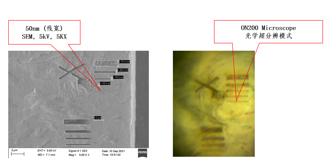 50nm 線寬的特征線, 由SEM確認(rèn)尺度,以O(shè)N200超分辨模式(ON200物鏡系統(tǒng))可以清晰完整觀察該特征線的連續(xù)像。