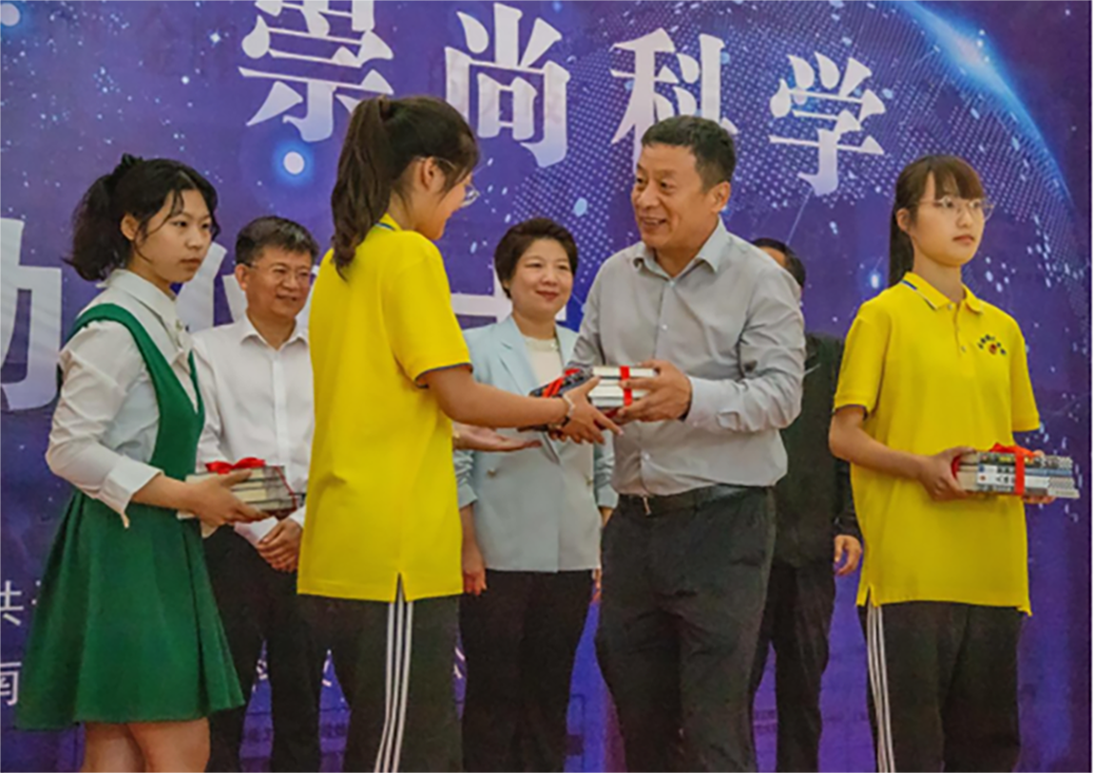 啟動儀式上,由孫欣代表主辦單位致辭,穆宏地、楊箴立共同為省科普基地建設單位河南中鏡科儀科技有限公司揭牌,徐杰、李志明等領導為7家省科普教育基地授牌,苗琛向青少年代表捐贈科普書籍,世界技能大賽冠軍姜雨荷作為科普志愿者代表講話。