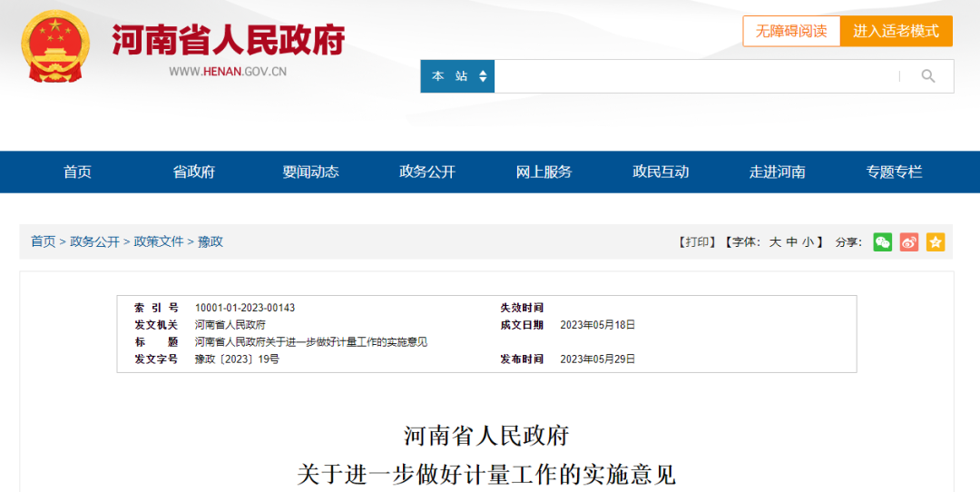 河南省人民政府 關于進一步做好計量工作的實施意見 豫政〔2023〕19號 各省轄市人民政府,濟源示范區、航空港區管委會,省人民政府各部門: 為深入貫徹落實國家《計量發展規劃(2021—2035年)》,進一步提升我省計量能力和水平,構建現代先進測量體系,為經濟社會高質量發展提供技術支撐和保障,結合我省實際,現提出以下實施意見,請認真貫徹落實。 一、總體要求 以習近平新時代中國特色社會主義思想為指導,全面貫徹落實黨的二十大精神,緊緊圍繞強國建設、民族復興中心任務,堅持“創新突破、改革引領,需求牽引、供給提升,政府統籌、市場驅動,協同融合、開放共享”的基本原則,以推動高質量發展為主題,加強計量科技創新、基礎能力建設和頂層設計,調動各方資源,完善計量工作協調推進機制,構建新時代全社會共建、共治、共享的計量事業發展新格局。 二、發展目標 到2025年,全省現代先進測量體系初步建立,計量科技創新和服務經濟社會高質量發展的能力進入全國先進行列。 計量科學技術水平顯著提升。加強基礎、前沿和應用領域計量技術研究,建立全國一流的新一代計量標準,攻克一批關鍵計量測試技術,研制一批具有原創性成果的計量標準裝置、儀器儀表和標準物質,建設一批計量科技創新先進測量實驗室,培養造就一支計量科學人才隊伍。 計量服務保障能力持續增強。面向我省重點發展領域和需求,統籌計量標準建設,系統規劃省、市、縣三級及授權技術機構的計量能力,大力推進數字化轉型升級,建設一批普惠性、基礎性、公益性計量基礎設施,建成一批國家、省級產業計量測試中心和省級計量重點實驗室,開發一批具有地方特色的計量測試項目,進一步完善全省量傳溯源體系,提升計量的基礎支撐保障能力,服務經濟社會高質量發展的計量體系日趨完善。 計量監管體制機制逐步完善。統籌全省計量監管工作,加強對涉及貿易結算、醫療衛生、安全防護、生態環境、能源資源、“雙碳”等重點領域及標準物質的計量管理。創新智慧計量監管模式,完善計量數據、行為、結果的全鏈條計量監管體制。增強社會計量溯源意識,建立健全開放共享的協同發展機制。加快推進我省計量管理條例、技術規范制定、修訂。 到2035年,全省計量科技創新水平大幅提升,量子計量應用技術進入全國先進行列。計量服務保障能力大幅增強,在線測量技術得到廣泛應用。智能監管模式日益成熟,計量監管更加科學有效。計量科學文化深入人心,共建共享的社會計量意識更加牢固,建成符合我省發展需求的現代先進測量體系。 三、重點任務 (一)強化計量科技創新。 1.加強計量基礎和前沿技術研究。強化測量基礎理論、計量整體解決方案、計量支撐經濟社會發展作用機理等研究。開展量子標準、量子傳感、精密測量等前沿技術基礎研究和創新應用。落實國家“量子度量衡”計劃,參與量子計量技術和計量標準裝置小型化技術研究,在量子傳感和芯片級計量標準技術方面實現突破。開展新一代信息技術、人工智能、生物醫藥、新材料、新能源、先進制造、食品加工等領域精密測量技術研究。 2.推進計量數字化轉型。開展網絡授時應用服務及研究,推廣應用國家強制檢定工作計量器具業務管理平臺。探索建設省計量檢定校準結果數字化平臺,建立省計量電子證書系統。開展產業計量數據的采集、管理和應用,建成國家計量科學數據中心河南分中心。在生命健康、裝備制造、糧食儲備、食品安全、環境監測、節能降碳、新能源交通等領域加強計量數據安全和可靠性監測系統建設,爭創國家計量數據建設應用基地。 3.開展計量技術研究和新型量值傳遞溯源技術創新。開展量熱技術、數字化模擬測量技術、工況環境監測技術等基礎共性計量技術研究;加強智能化計量校準技術、計量功能軟件安全測評技術和新型傳感技術研究;建立計量新技術、新方法向產業轉移的服務平臺;針對復雜環境、實時工況環境和極端環境的計量需求,開展遠程校準、在線計量量值傳遞、溯源方法和多參數、多功能自動化計量檢測等方面的技術研究和創新,推廣應用遠程、在線、動態、快速檢測技術,提高數據的準確性和可靠性;加快推進計量標準智能化、網絡化。 4.構建良好計量科技創新生態。鼓勵計量技術機構、高校、科研院所、創新型企業等建立聯合開發、優勢互補、成果共享的協同創新機制,組建跨地區、跨行業高水平先進計量測試實驗室等研發機構。成立河南省計量科技創新委員會,建設計量科技創新生態伙伴聯盟。構建計量、質量、標準、知識產權等融合聯動的計量科技成果轉化服務體系。 (二)深化產業計量服務。 5.支撐新興產業高質量發展。聚焦新興產業領域“測不了、測不全、測不準”難題,實施制造業計量能力提升工程,建立一批先進制造業發展急需的高準確度、高穩定性計量標準,強化國家新能源汽車供能裝置、智能通信終端等國家產品質檢中心計量檢測能力。開展產業計量基礎能力提升行動,實施工業強基計量支撐計劃,建設磨料磨具、氣體傳感器、裝備制造、能源、新興材料等一批國家或省級產業計量測試中心,加強關鍵計量測試技術、測量方法研究和裝備研制,為產業發展提供全溯源鏈、全產業鏈、全壽命周期并具有前瞻性的計量測試服務,支撐我