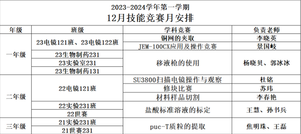 本次技能競賽月共開展了8個項(xiàng)目,競賽項(xiàng)目覆蓋實(shí)驗(yàn)技術(shù)學(xué)院全體學(xué)生。競賽項(xiàng)目有:銅網(wǎng)的夾取、JEM-100CX應(yīng)用及操作競賽、移液槍的使用、SU3800掃描電鏡操作與觀察、修塊比賽、鹽酸標(biāo)準(zhǔn)溶液的標(biāo)定、puc-T質(zhì)粒的提取、材料樣品切割。